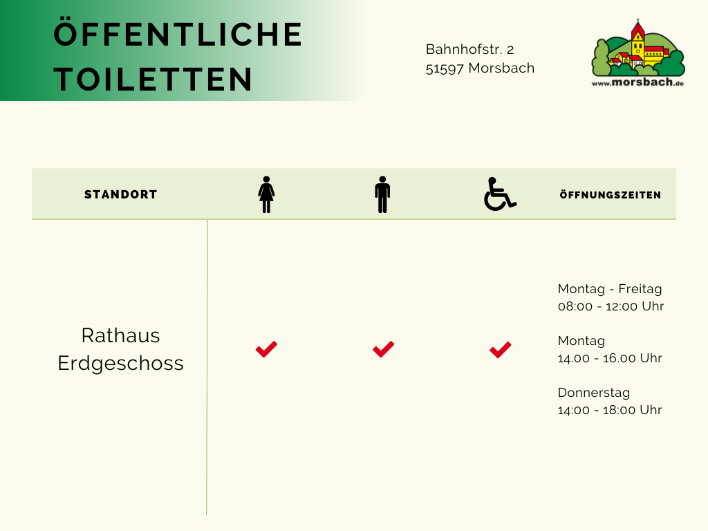 Alle, die in Morsbach unterwegs sind und ein „stilles Örtchen“ suchen, können im Rathaus der Gemeinde Morsbach fündig werden. Die Toiletten sind kostenfrei nutzbar.